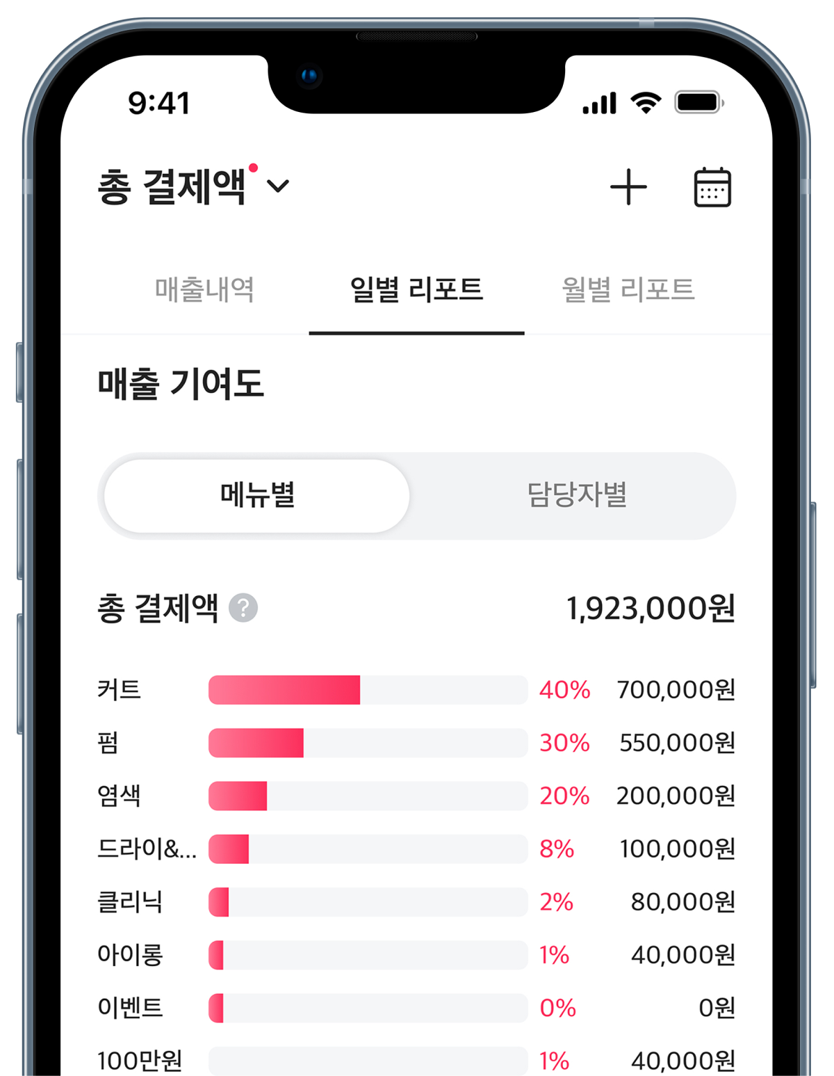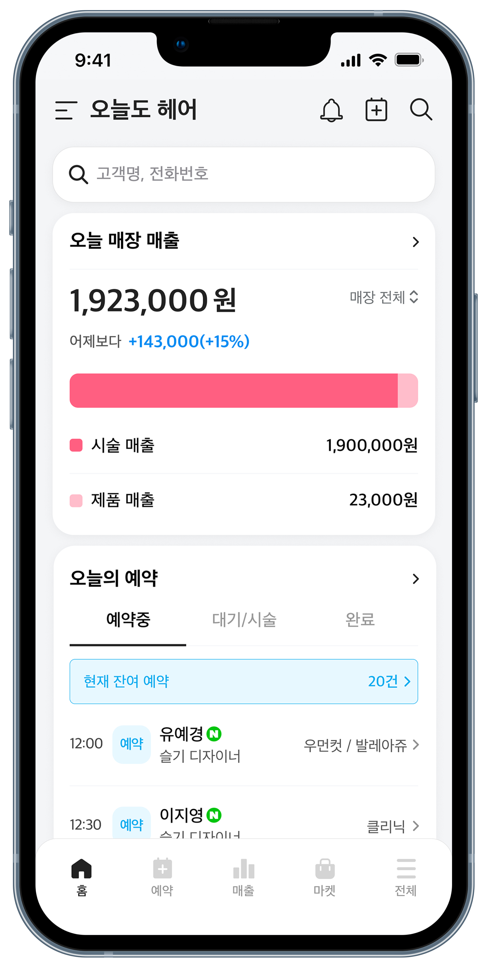 맨 처음엔 무료라 그래서 별 기대 없이 사용하다 만족도가 너무 높아 리뷰 남겨요~ 매장을 운영하고 있는 사람으로써 각 직원들별로 예약 스케쥴 확인, 매출내역 등 시간상 매장에 항상 상주하여 있지 못하는데도 디테일하게 관리가 가능하구요. 일단 메인 화면 레이아웃에 딱딱 보기쉽게 정렬 되어있고 필요한 카테고리들이 잘 노출되어 있어서 이용하기가 좋네요!