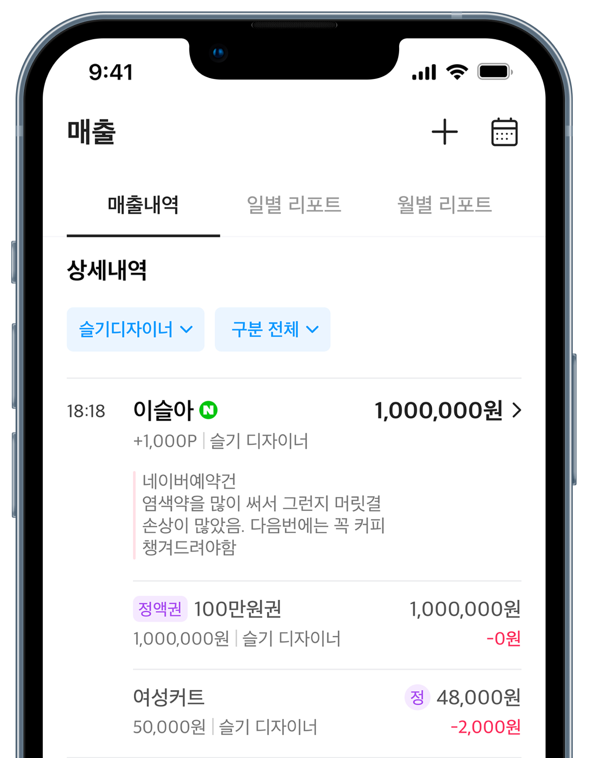 개인샵을 운영하는 상황에서도 혼자 관리하기 쉽도록 구성되어있어 편리하게 사용중이에요 효율적이고 편해서 꾸준히 사용하고싶은 어플이네요 정기적으로 개발 및 업데이트가 되면 더 좋을 것 같습니다